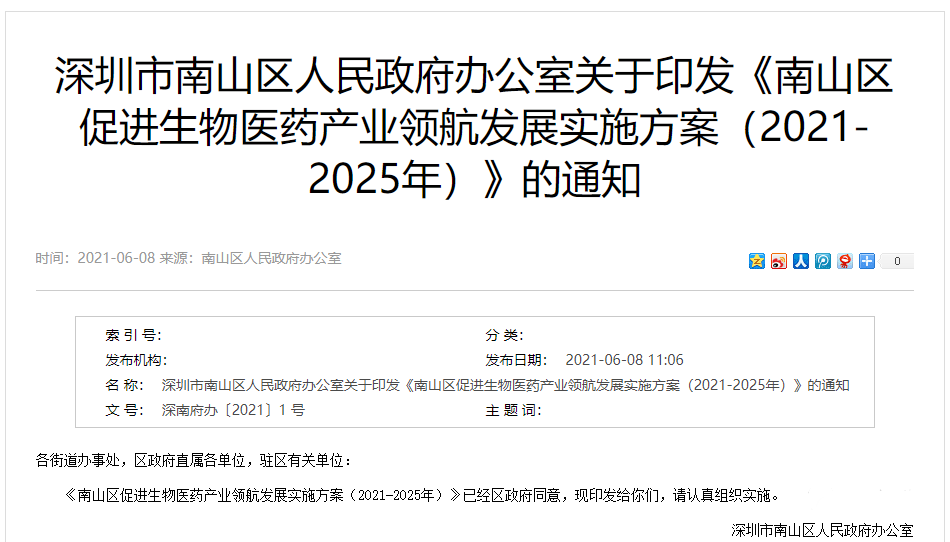 2021年6月8日,深圳市南山区在官网上正式发布深圳市南山区人民政府办公室关于印发《南山区促进生物医药产业领航发展实施方案(2021-2025年)》的通知。实施方案中明确提出:助力精准医疗产业壮大。加强基因检测领域技术开发和干细胞临床试验先行先试。支持企业开发基因检测技术,在疾病筛查、新冠病毒核酸检测等领域推广应用。支持个体化细胞治疗技术国家地方联合工程实验室建设,推进细胞产业技术与管理规范标准化建设。支持自贸区内医疗机构和科研机构开展干细胞、免疫细胞、基因治疗等新技术研究和转化应用。(责任单位:区卫生健康局、区科技创新局、区工业和信息化局)